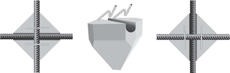 שומרי מרחק מבטון מיוחדים – פירמידה ייחודית לרשת עליונה ותחתונה, משולבים לולאות קשירה / קליפסים לחיבור לרשתות ברזל בקטרים שונים.