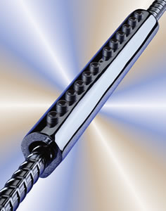 ZAP mechanical splice for extending existing rebar, fits onto a rebar end and locks into place with shear screws. For rebar with a 12-57 mm diameter.